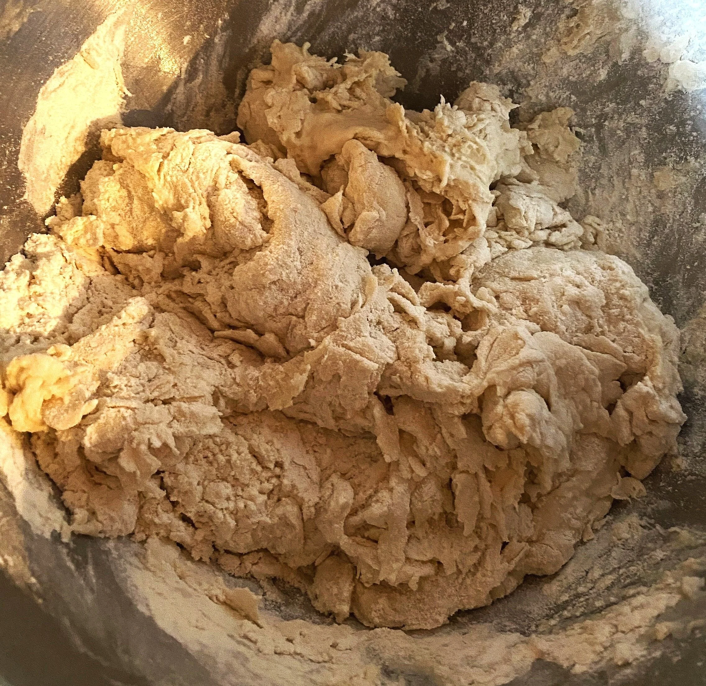 At this stage, you may find the dough is too loose. Add just enough all purpose flour to create a very sticky, fairly loose dough with a softness that borders on unworkable.